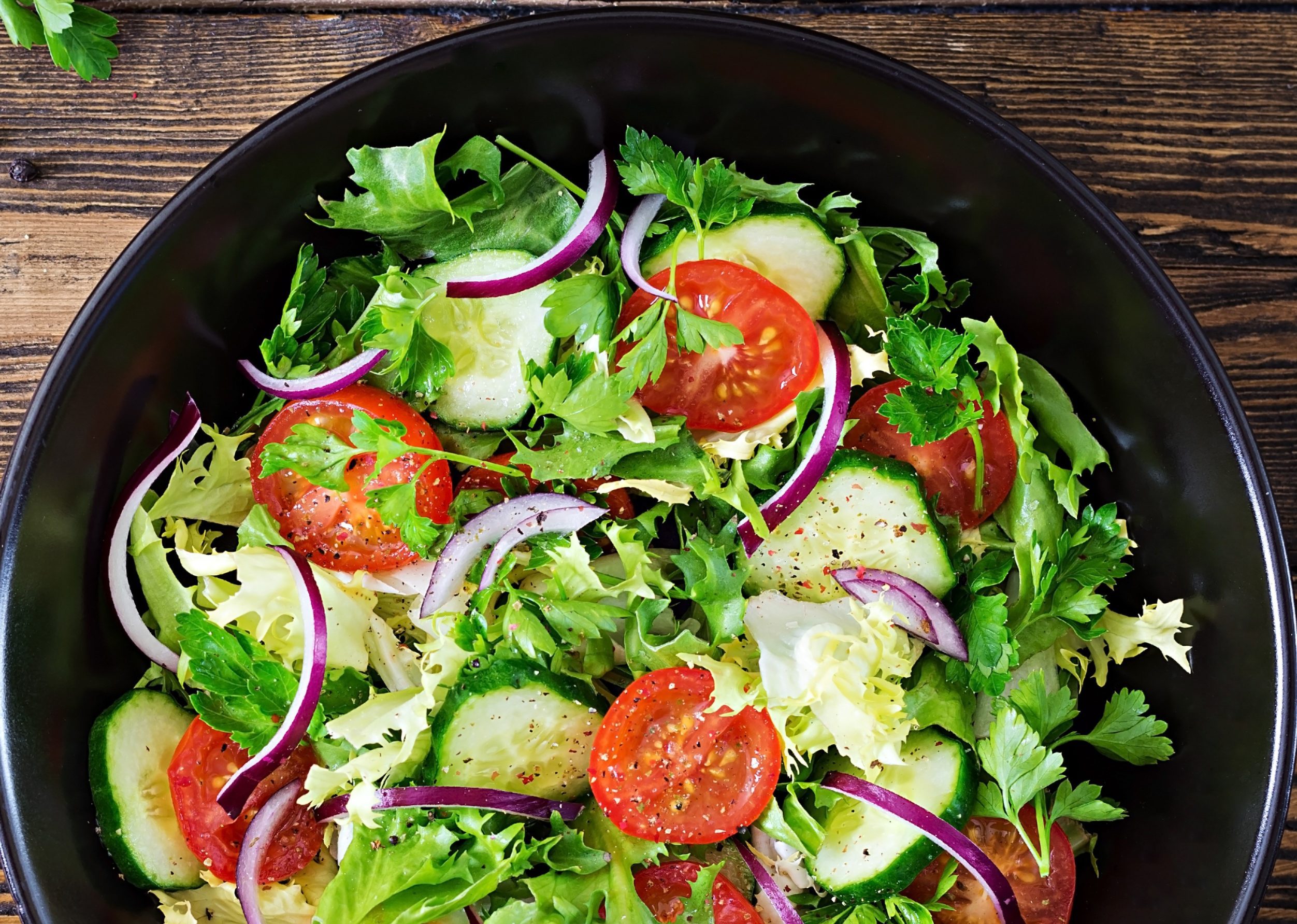 Refreshing and flavourful salad with a mix of red onion, cucumbers, crisp salad greens, cocktail tomato, onion powder, garlic powder, salt and ground black pepper, salad dressing